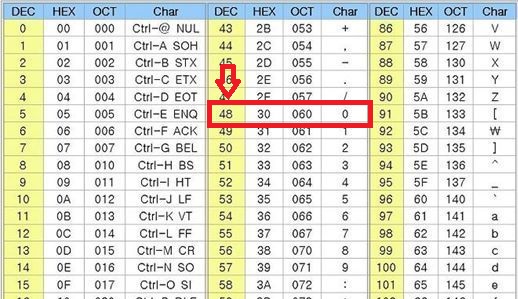 ▼ 다음은 아스키 코드 표의 일부다.